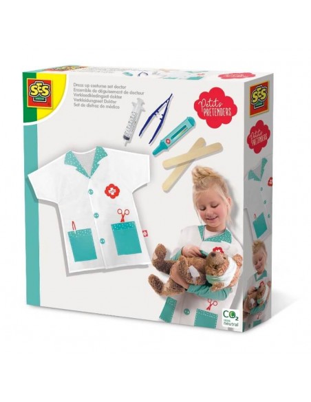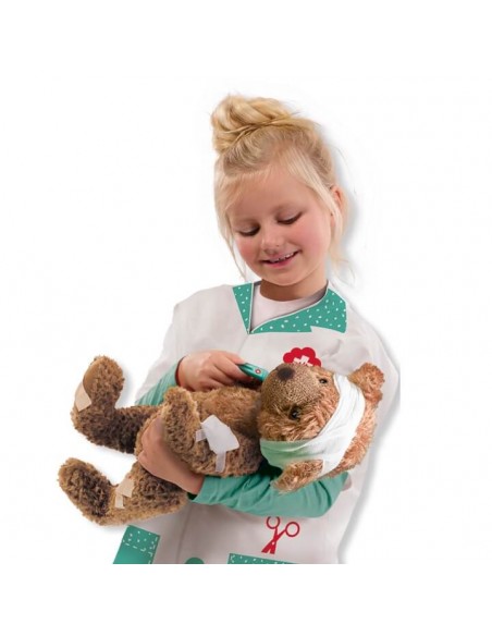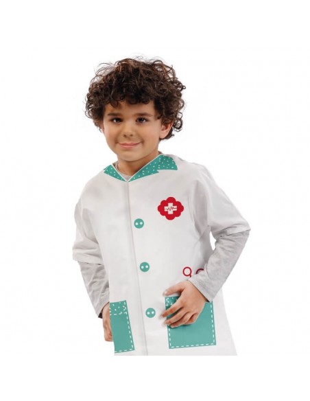 Bu kostüm ve oyun seti, 1 doktor önlüğü, oyuncak termometre, 2 dil kaşığı, cımbız ve şırıngadan oluşur.