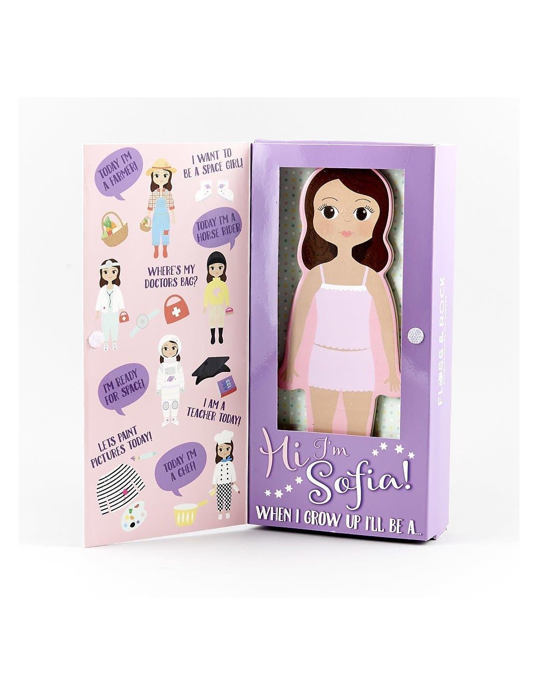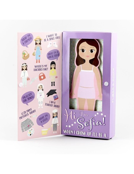 Floss & Rock Mıknatıslı Giydirme Setinin karakteri Sofia çok meraklı ve ileride olabileceği astronot, çiftçi, sanatçı, hemşire ve daha birçok mesleği hayal ediyor. Bu yüzden hayallerini süsleyen mesleklerin bütün kıyafetlerine sahip. Ayrıca Floss & Rock Mıknatıslı oyun setinin içinde ilk yardım çantası, sanatçı paleti, oklava ve daha fazlasını içeren temel aksesuarlar da bulunmaktadır. Giydirme Setinin içindeki tüm parçalar ahşaptan yapılmıştır ve mıknatıslıdır. Ayrıca Floss & Rock'ın muhteşem kutusunda, bir tarafta yatak odası ve arka tarafta dış mekan manzarası olan katlanmış bir arka plan bulunur.